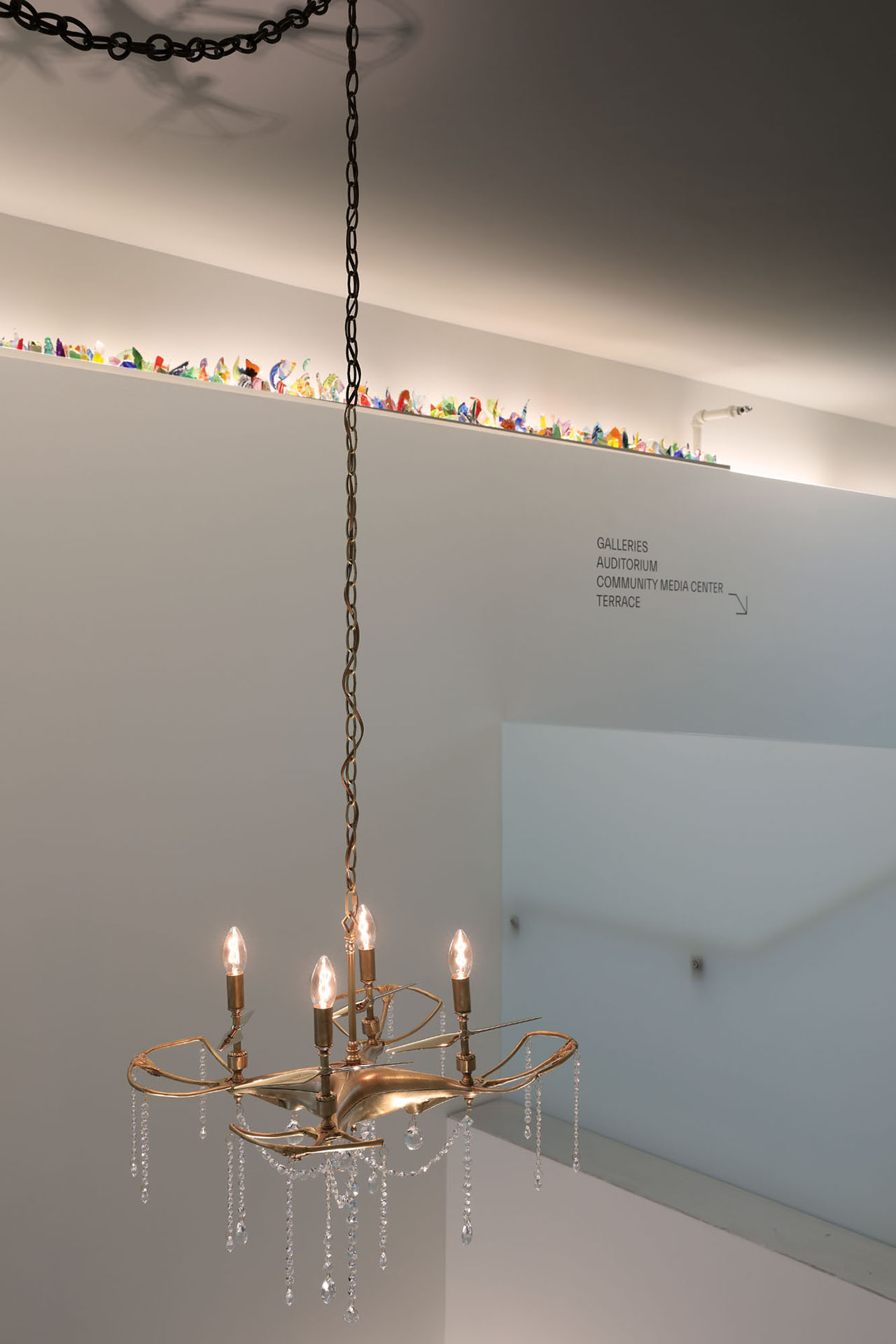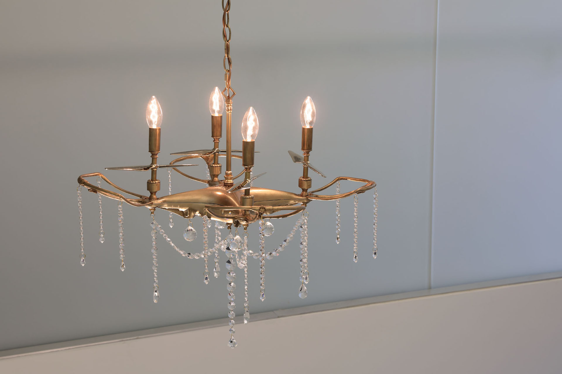 cast brass, PVD gold-plated brass, found crystal, lead crystal, lighting hardware, wiring
