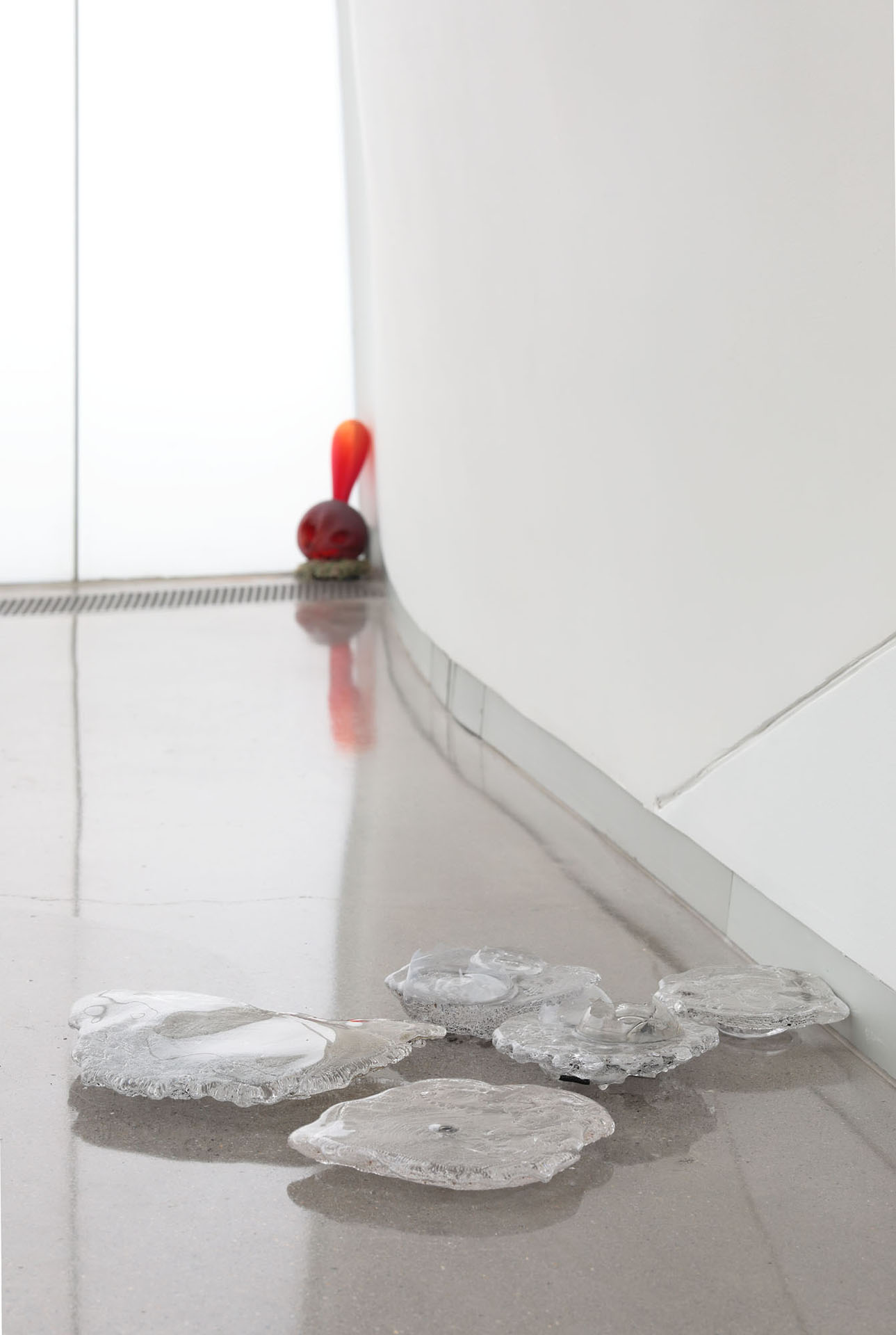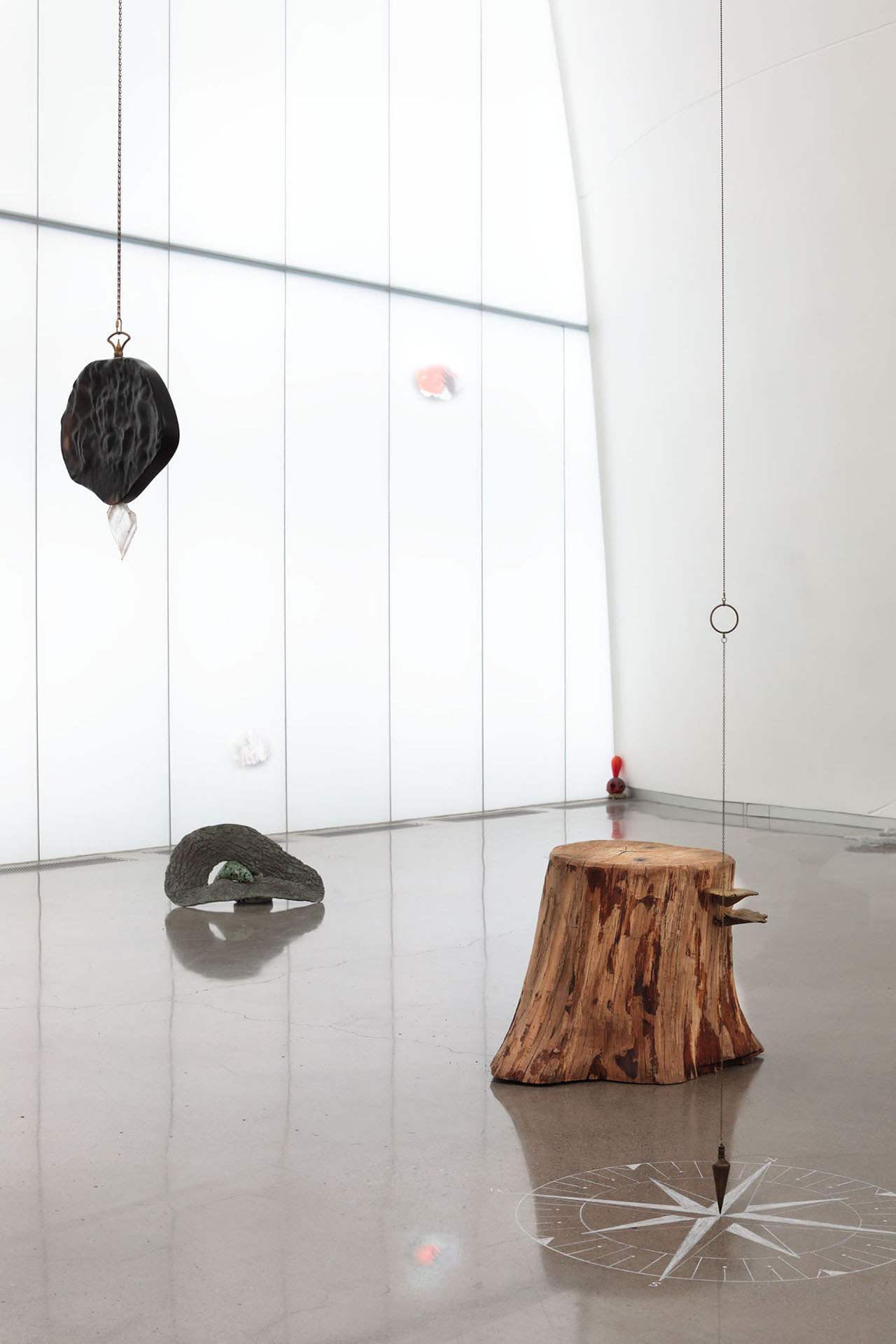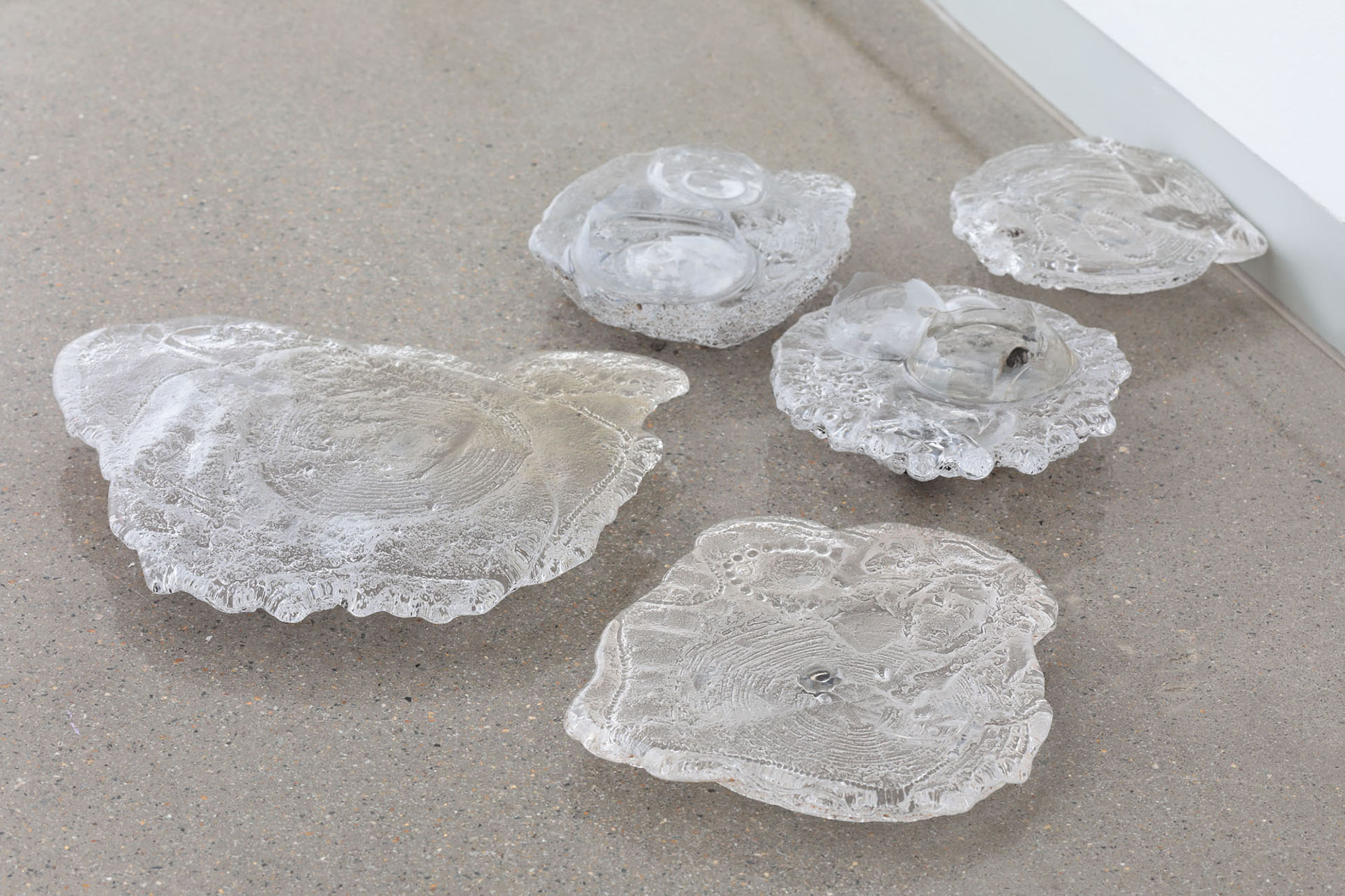 This newly commissioned body of work grew out of the artist’s interest in landscapes that have been profoundly transformed by military and tourism activity. Over repeated visits during full-moon cycles, Cox-Richard conducted rituals that left behind impressions in the sand at White Sands, New Mexico, a place that is home to a national park and an active missile range where the first atomic bomb was tested. They then used 3D scans of those impressions—as well as others from sites with complex human histories—to create molds for the cast glass mirrors.