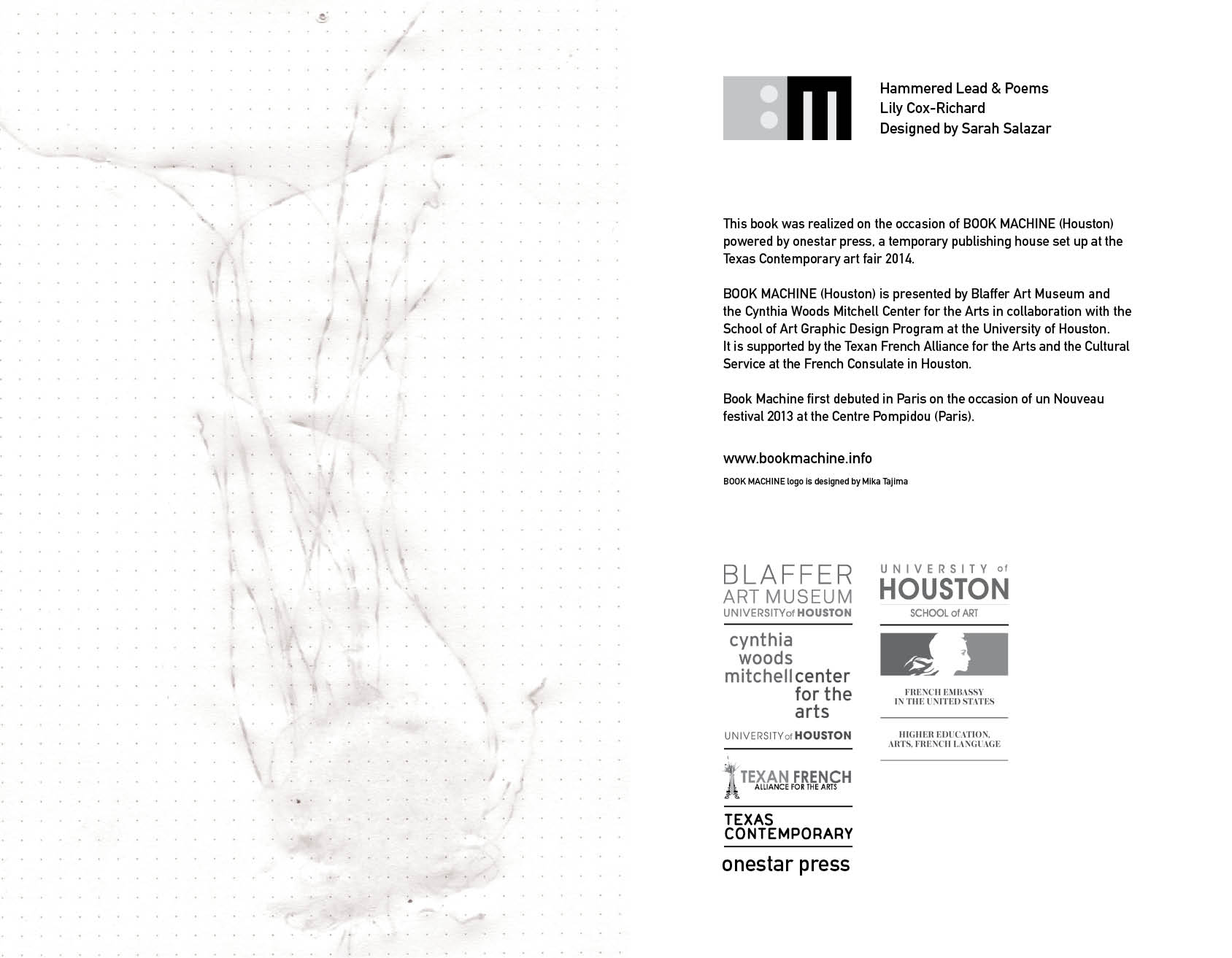 Hammered Lead & Poems is a project realized on the occasion of BOOK MACHINE (Houston) powered by onestar press, a temporary publishing house set up at the Texas Contemporary art fair 2014.