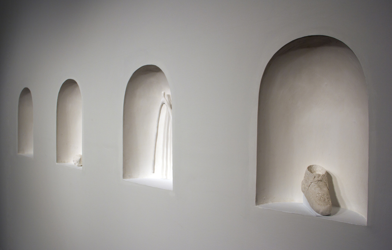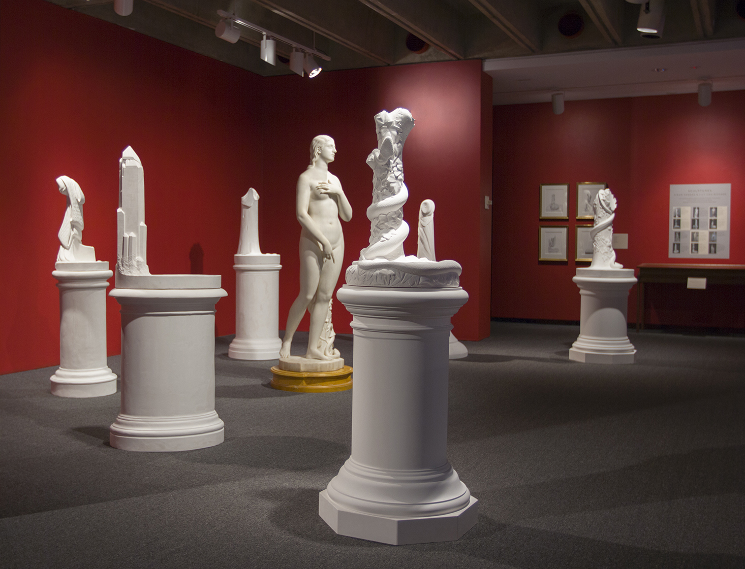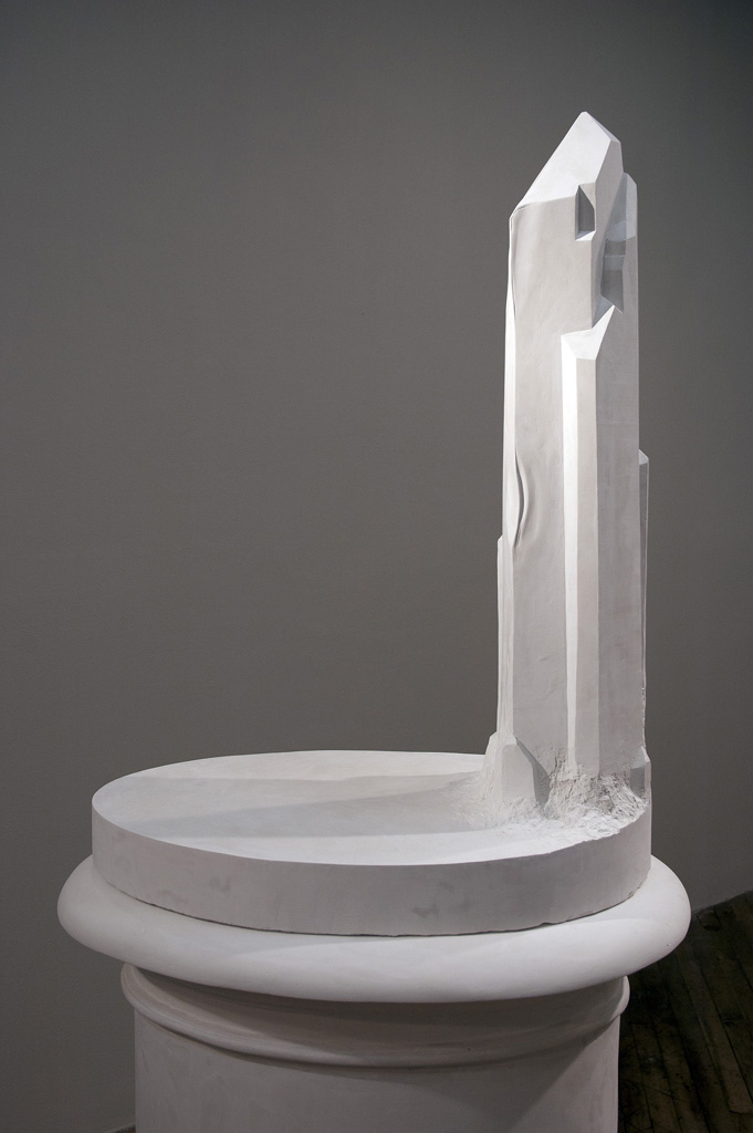 The Stand (Possessing Powers) deals with sculptural traditions, American history, gender and form. Each of my carved plaster sculptures takes on a major work by Hiram Powers (1805-1873), once considered the Father of American Sculpture. I carve these works without the figures, focusing on the supporting elements, and the contact points between figure and support. In my process of making and unmaking, figure and ground conflate into new forms.