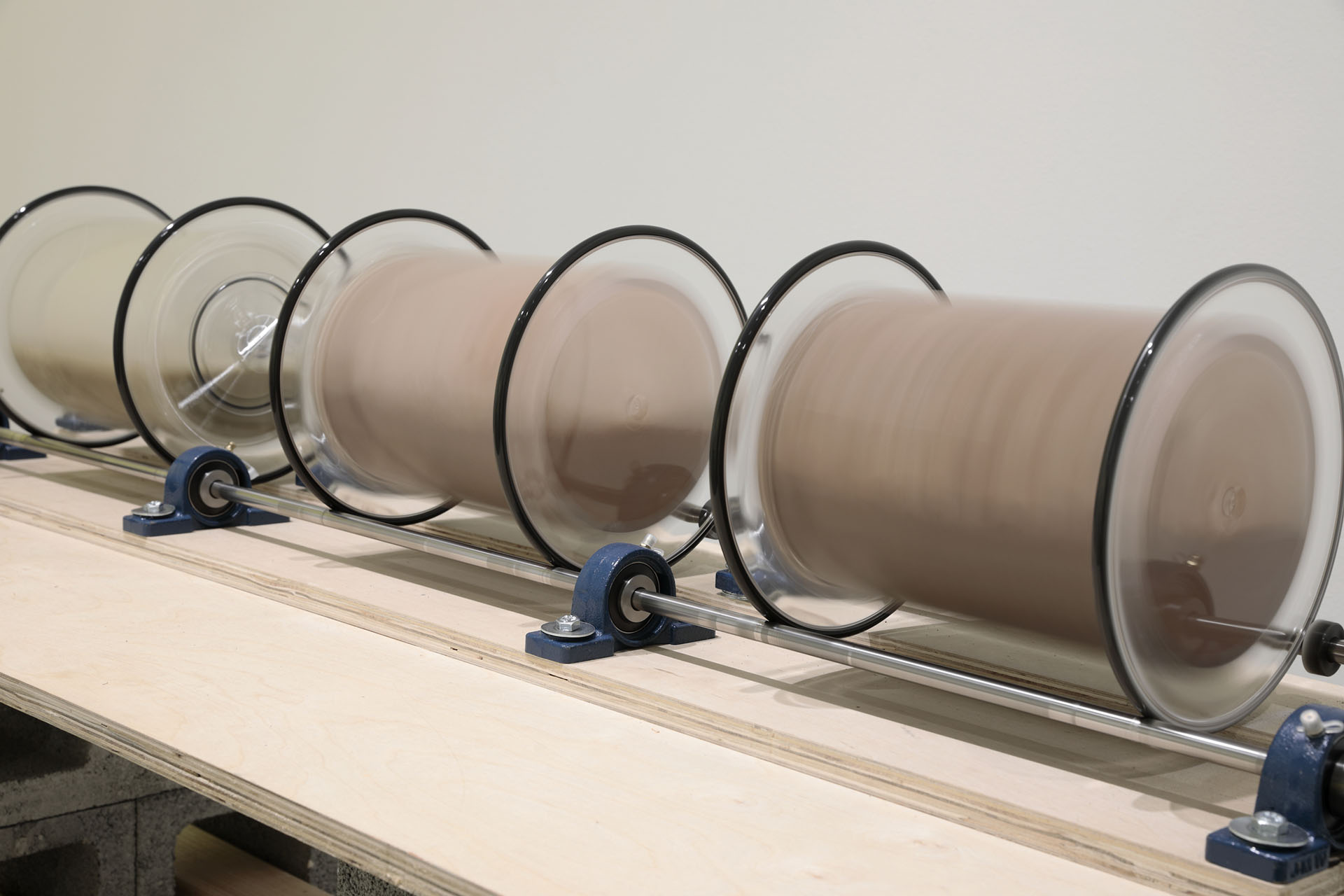 Rapids, Library of Radical Returns, 2019 (River water, silt, grit, riprap, bits of hand-pressed local clay, motors, hardware, acrylic barrels)
