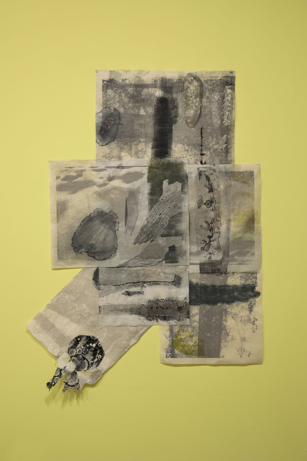 collaged prints made with rock tumbling slurry, drawings made on site