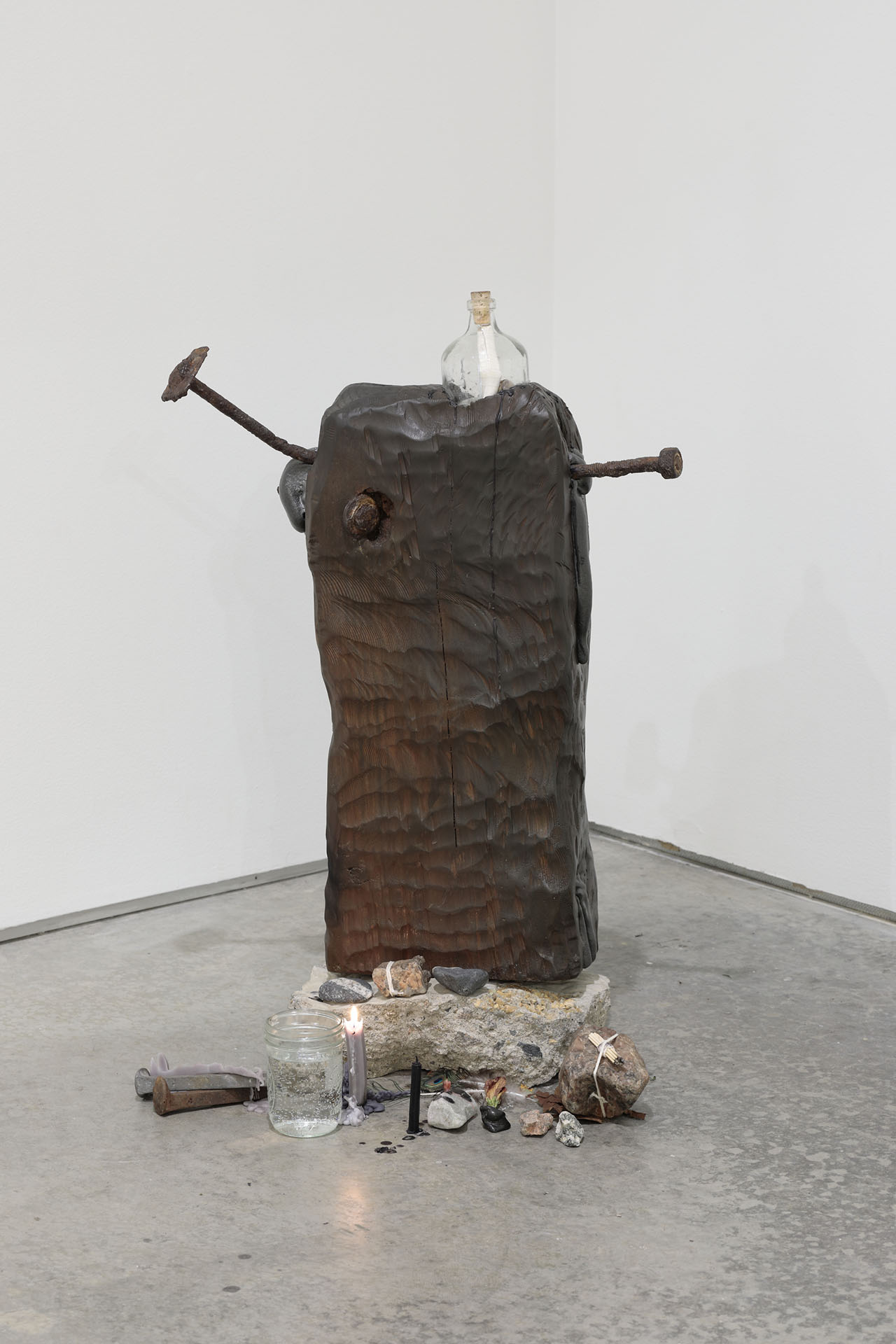 driftwood, rocks, concrete, candles, offerings